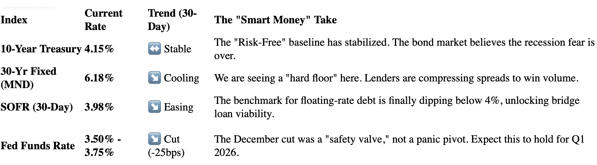 The Executive Thesis: Uncertainty kills deals, not rates. For most of 2025, the market was paralyzed by the fear of where rates might go. As we close the year with the 10-Year Treasury settling near 4.15%, we have achieved something critical: Predictability towards Stability.